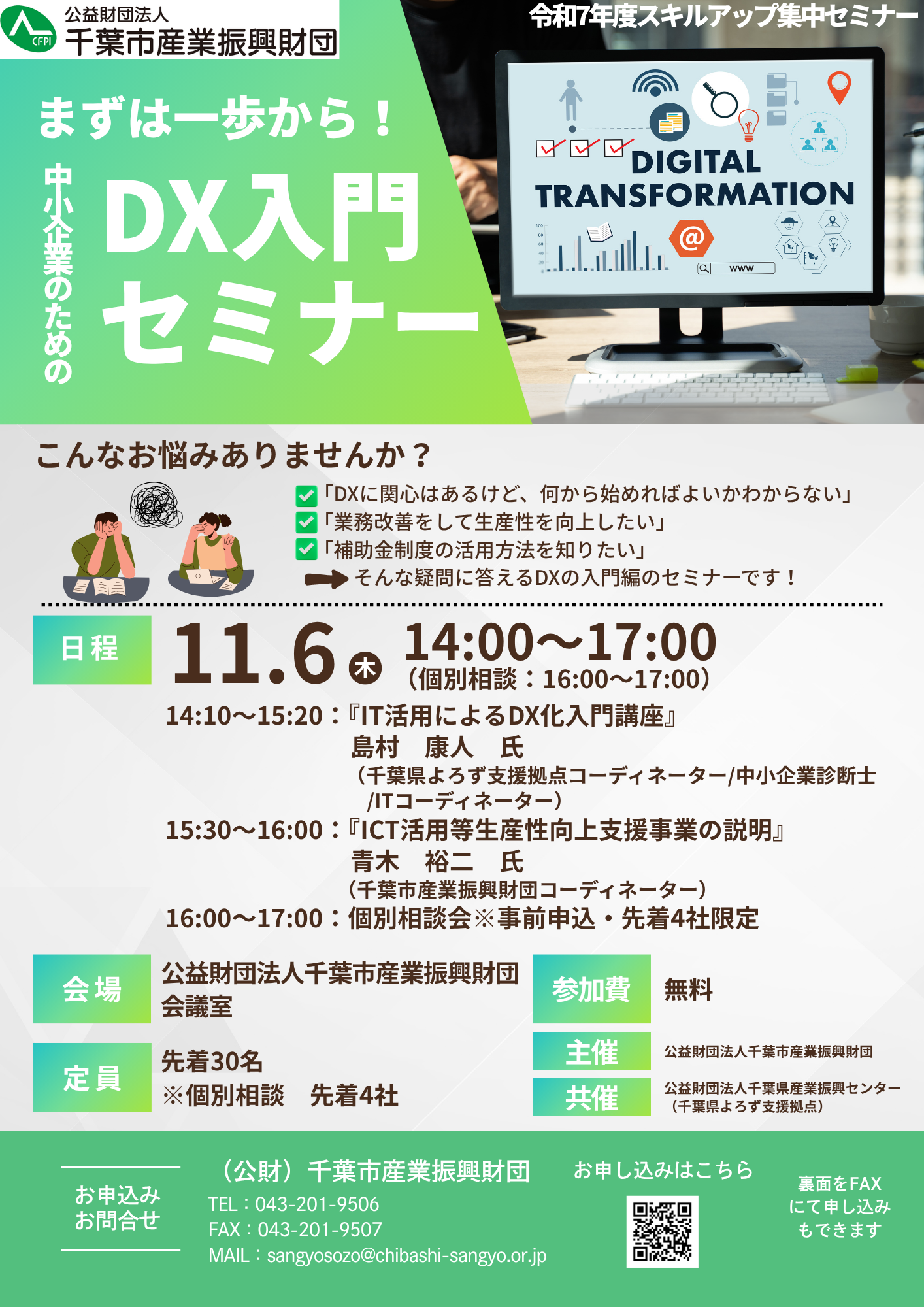 本セミナーでは、千葉県よろず支援拠点の島村コーディネーターにDXの必要性や導入ステップを解説いただき、千葉市産業振興財団の青木コーディネーターから実際に活用できる補助金制度についても説明します。この機会にDXの一歩目を踏み出しませんか?