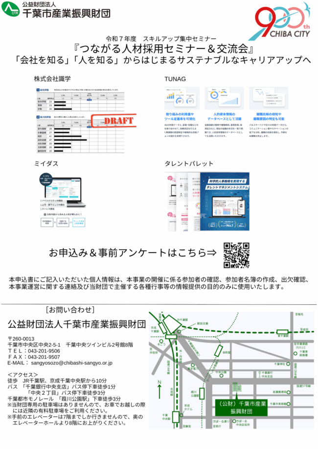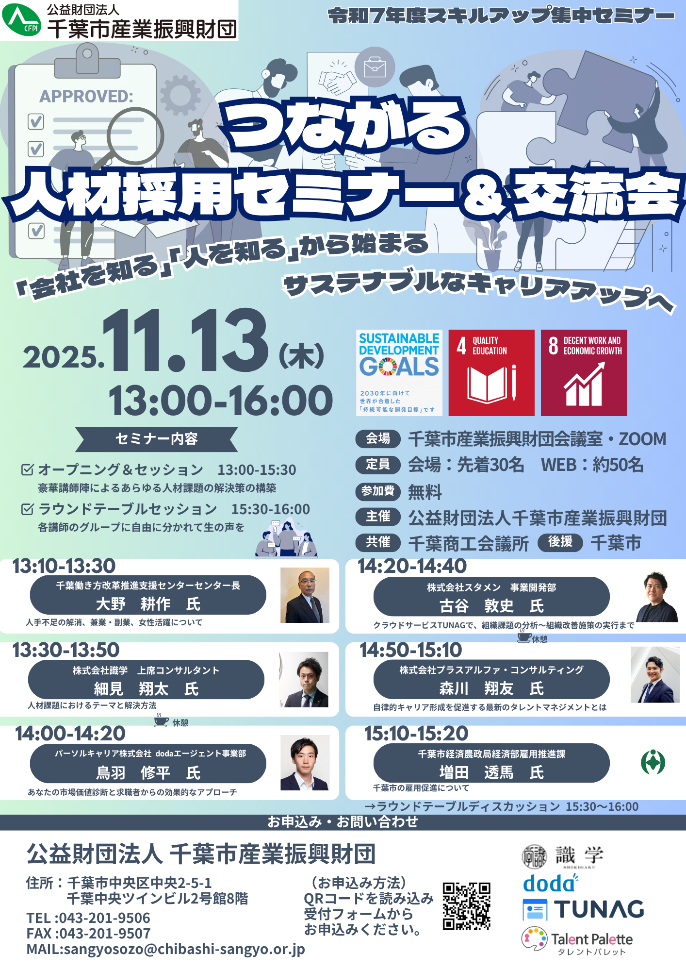 本セミナーでは、企業と求職者がリラックスした雰囲気の中で対話することで、互いの価値観や人柄を理解し、納得感のある採用につなげる手法をご紹介します。さらに、入社後の定着や活躍を支える「職務の仕組み」や「評価の明確化」など、組織づくり・人材育成のヒントもお届けします。