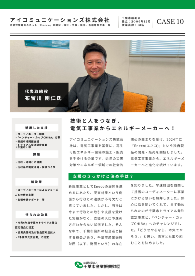 アイコミュニケーションズ株式会社は、電気工事業を基盤に、再生可能エネルギー設備の施工・販売を手がける企業です。現在はさらに独自開発のエネルギーソリューション事業へと事業領域を広げています。代表の布留川剛仁氏は、大手電力会社を退職後、同社に入社。営業職からスタートし、「より多くの人に、納得できる価格で、必要な価値を届けるには何が必要なのか、何ができるのか」を常に考え、行動しました。